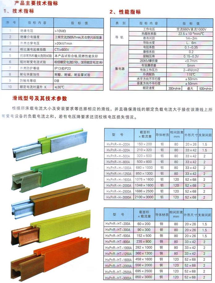 注:1、滑觸線標準長度:6m。 2、HXPnR-H與HXPnR-H B 以及HXPnR-H A 性能相同,幾何形狀和集電方式不同。 3、HXPnR-H型有鋁合金和銅體兩種材料的滑線。