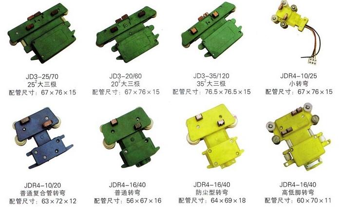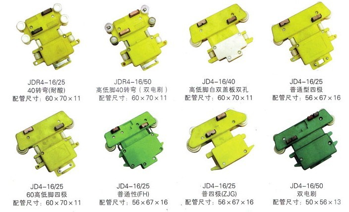 JD系列滑觸線集電器是滑線系統中最主要的部件之一。集電器是滑觸線系統中集電側拾取電能的主要裝置,滑觸線集電器通過集電刷與導軌的滑動接觸,將電能直接傳導至用電器,從而實現系統的移動供電。集電器由機械結構的張力裝置和直接與導軌滑動接觸的集電刷兩部分組成。