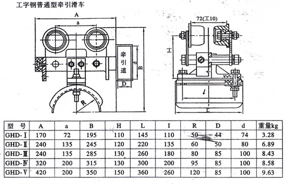 用于移動供電機械在移動中電纜的懸吊與移動,已廣泛應用于各類起重機械中。工字鋼電纜滑車該裝置具有結構堅固。移動靈活。安全可靠等優點。滑車由牽收引滑車、電纜滑車、終端滑車三部分組成,牽引滑車跟隨移動機械導纜(牽引)裝置,每個移動機械配1個,隨移動機械往返運行。中間電纜滑車將電纜懸掛在工字鋼軌道范圍內隨牽引滑車移動,兩端并裝有緩沖撞頭,滑車視移動長度不同而定數量。終端滑車固定在工字鋼導軌末端,一般每個移動機械設置1個。工字鋼電纜滑車該系列滑車分Ⅰ、Ⅱ、Ⅲ、Ⅳ、Ⅴ五種型號,如用戶采用12#、14#、16#或更大號數工字鋼,可在訂貨時注明,本廠可成套供貨。